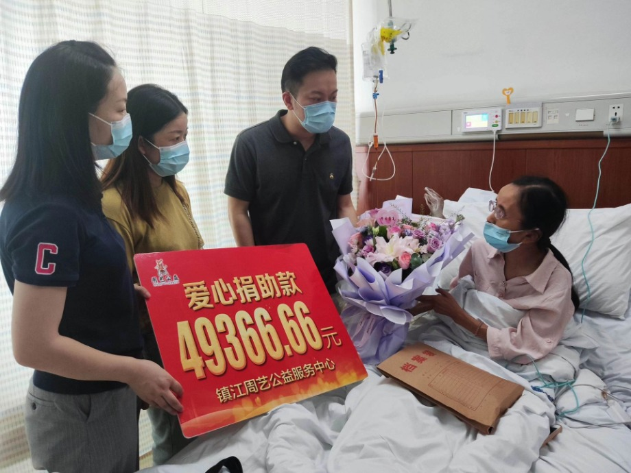 今日镇江讯(张驰川)“谢谢所有好心人,我一定配合治疗,快点好起来。”9月8日上午,市一院的一张病床旁充满了爱意,爱心人士朱杏玉等5人带着4.9万余元现金、水果、鲜花和57颗爱心到这里看望正在化疗的镇江周艺公益服务中心行政负责人、办公室主任陈雷。
