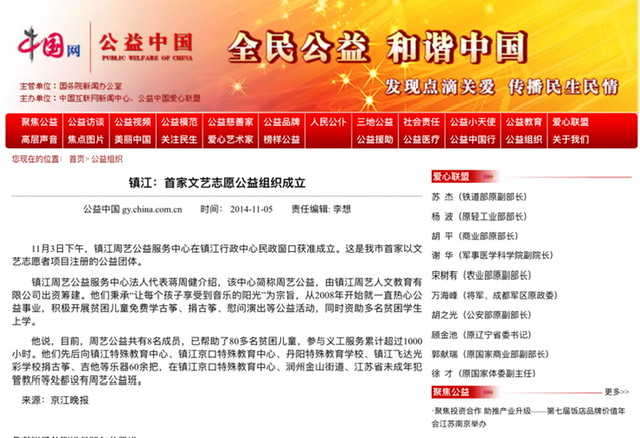 镇江周艺公益服务中心法人代表蒋周健介绍,该中心简称周艺公益,由镇江周艺人文教育有限公司出资筹建。他们秉承“让每个孩子享受到音乐的阳光”为宗旨,从2008年开始就一直热心公益事业,积极开展贫困儿童免费学古筝、捐古筝、慰问演出等公益活动,同时资助多名贫困学生上学。