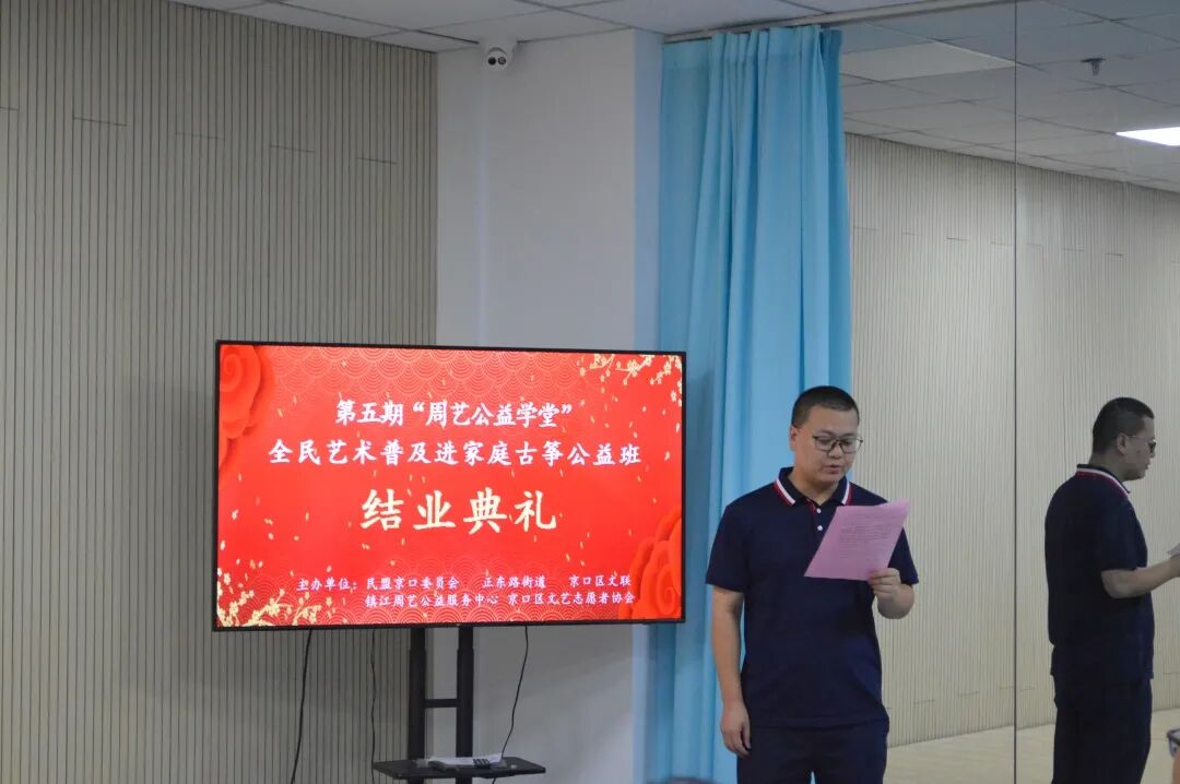 7月26日下午,第五期“周艺公益学堂”全民艺术普及进家庭古筝班结业典礼在江苏周艺教育周艺之家顺利举行。出席本次结业典礼的有京口区正东路街道党工委书记曹蕾,京口区委宣传部副部长、区文联主席巫长龙,民盟京口委员会常务副主委、江苏周艺教育校长蒋周健,镇江周艺公益服务中心主任高龙龙。镇江周艺公益服务中心副主任谈仕盛主持结业典礼。