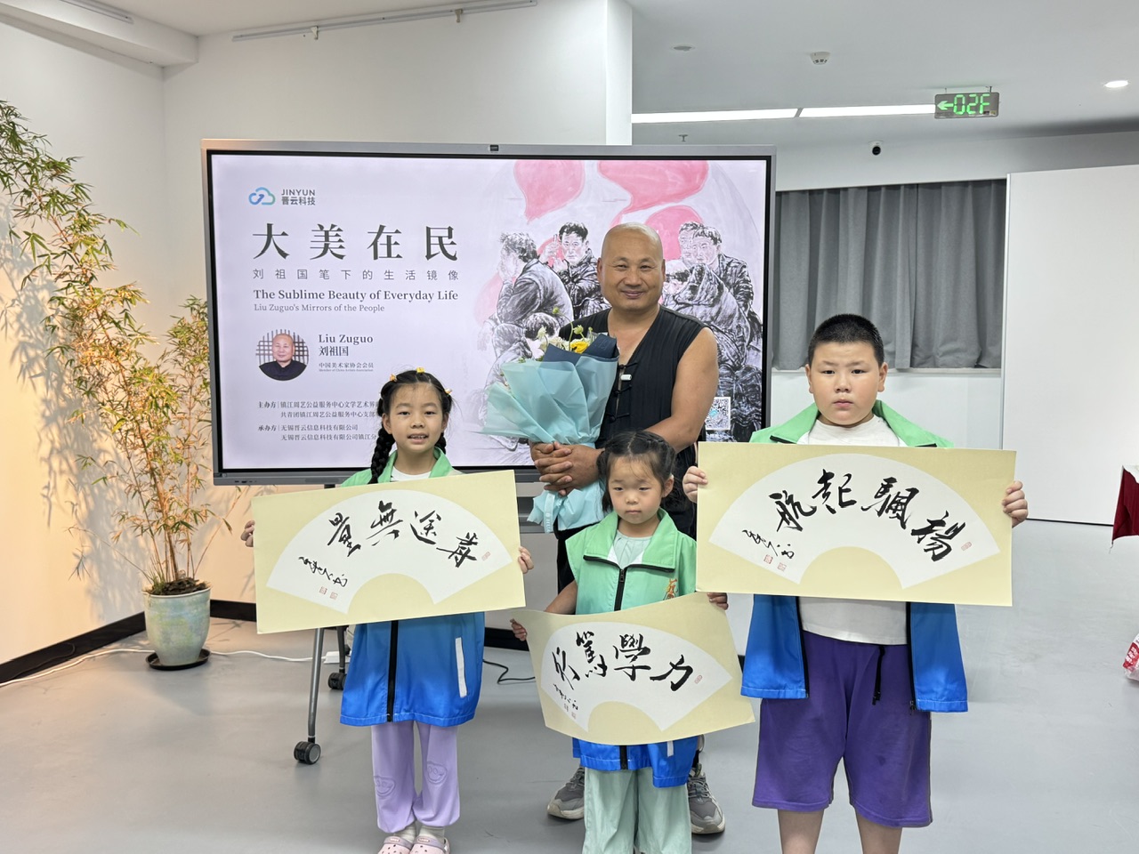 当艺术殿堂向纯真的童心敞开怀抱,一场社会艺术实践课悄然上演。8月2日,在镇江工人文化宫二楼展馆举办的“大美在民:刘祖国笔下的生活镜像”主题画展现场,迎来了一群特殊的、充满好奇的小观众——他们是镇江周艺公益服务中心“爱心暑托班”的孩子们。在周艺公益的组织下,这群孩子走出暑托班的课堂,走进真实的社会艺术空间,开启了一次浸润心灵的美育实践之旅。