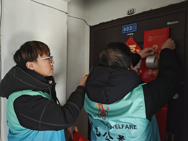 除爱心善款外,周艺公益还为该家庭准备了春联、福字等新春礼品。王琮琪、蒋俊杰现场将春联、福字张贴在张家门窗与客厅,红彤彤的新春装饰让原本冷清的家中瞬间洋溢起浓浓的年味。张召振的儿子康康(化名)看到“福”字入户,脸上露出了久违的开心笑容。