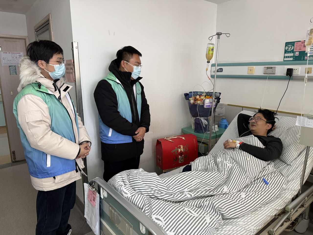 在病房内,支部组织委员刘源代表组织详细询问了张林的病情、治疗情况及康复进展,细心叮嘱他安心休养、积极配合治疗,保持乐观向上的心态。慰问组鼓励张林坚定康复信心,安心调养,争取早日痊愈、重返集体。