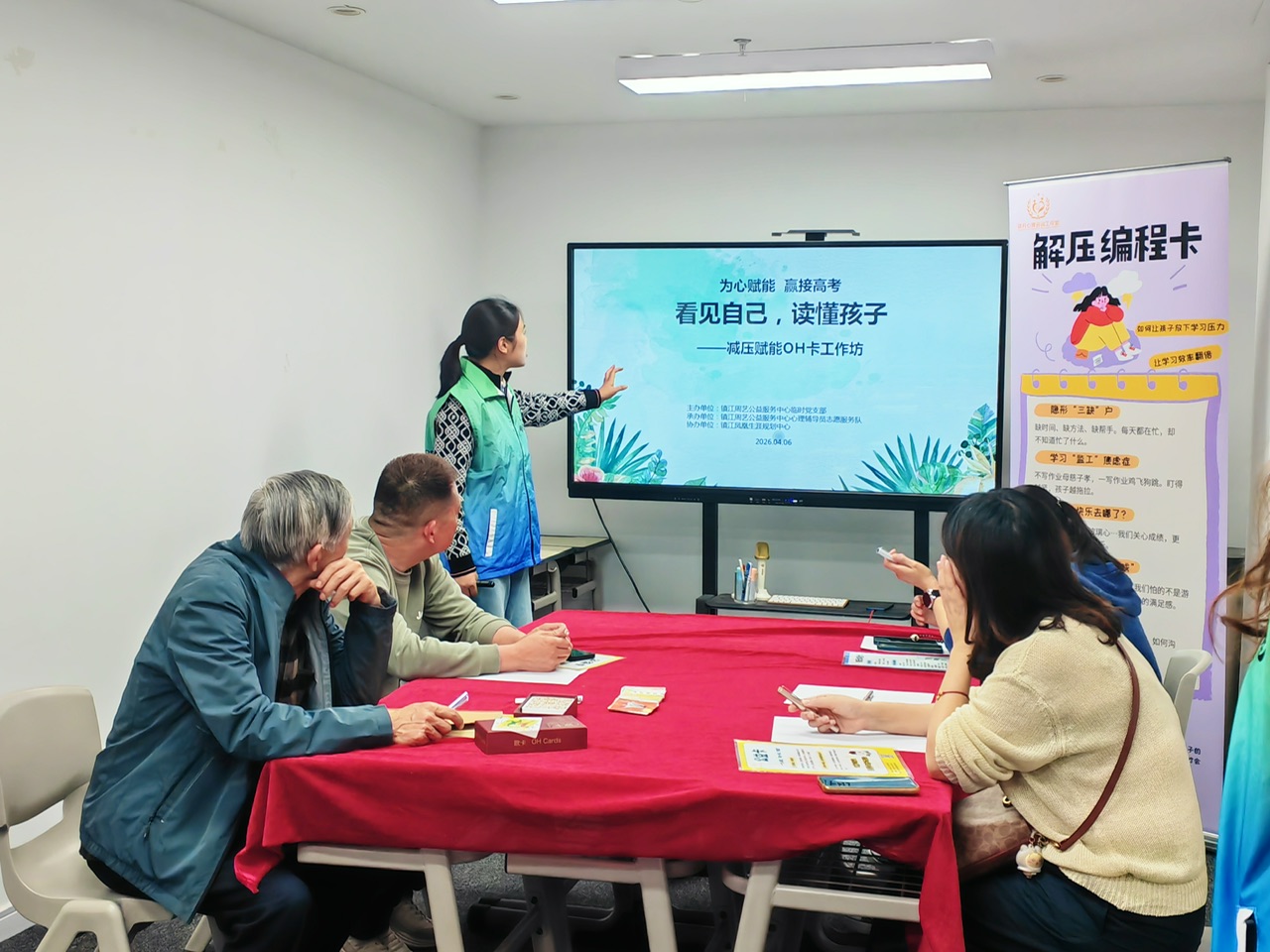 镇江周艺公益服务中心副理事长、党支部书记朱银慧在活动中介绍:“高考不仅是孩子的战役,更是整个家庭共同面对的挑战。家长情绪稳定,就是给孩子最好的定心丸。”