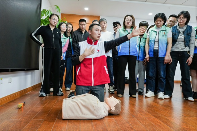 实操环节将培训推向高潮。志愿者们分成两组,利用人体模型和训练用AED轮流练习。两位老师手把手纠正动作:“手臂要伸直,用上半身力量垂直下压”“每次按压后要让胸廓充分回弹”。现场还模拟了突发倒地场景,志愿者需在老师指导下完成判断环境安全、拍打呼喊、呼救、胸外按压、人工呼吸及AED使用的完整流程。志愿者们反复练习,不少人在第一轮按压后感到手臂酸痛,但仍坚持完成多轮训练,力求每个动作规范到位。