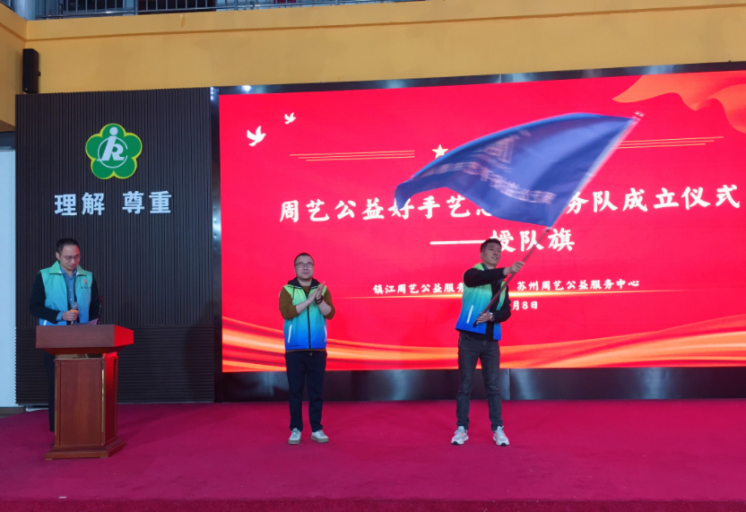 活动由民盟镇江市委会、镇江周艺公益服务中心、苏州周艺公益服务中心主办。仪式上,江苏省青年志愿者协会理事、镇江周艺公益服务中心理事长蒋周健为“好手艺”志愿服务队授旗,副理事长王琮琪为队长丁良、副队长庄海峰、侯陆祥颁发聘书。丁良说,服务队将坚定秉承周艺公益的创新理念,“以丰富人民群众精神文化生活为宗旨,提升人民文艺修养为根本”,把助人当作自助,把奉献当作信仰,让志愿力量互帮互助,团结一心,肩负起手艺人的担当和责任。