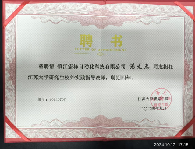日前,民盟镇江周艺公益服务中心支部盟员潘元志获聘江苏大学研究生校外实践指导教师,其所在单位镇江宏祥自动化科技有限公司被设为江苏大学研究生实践基地。