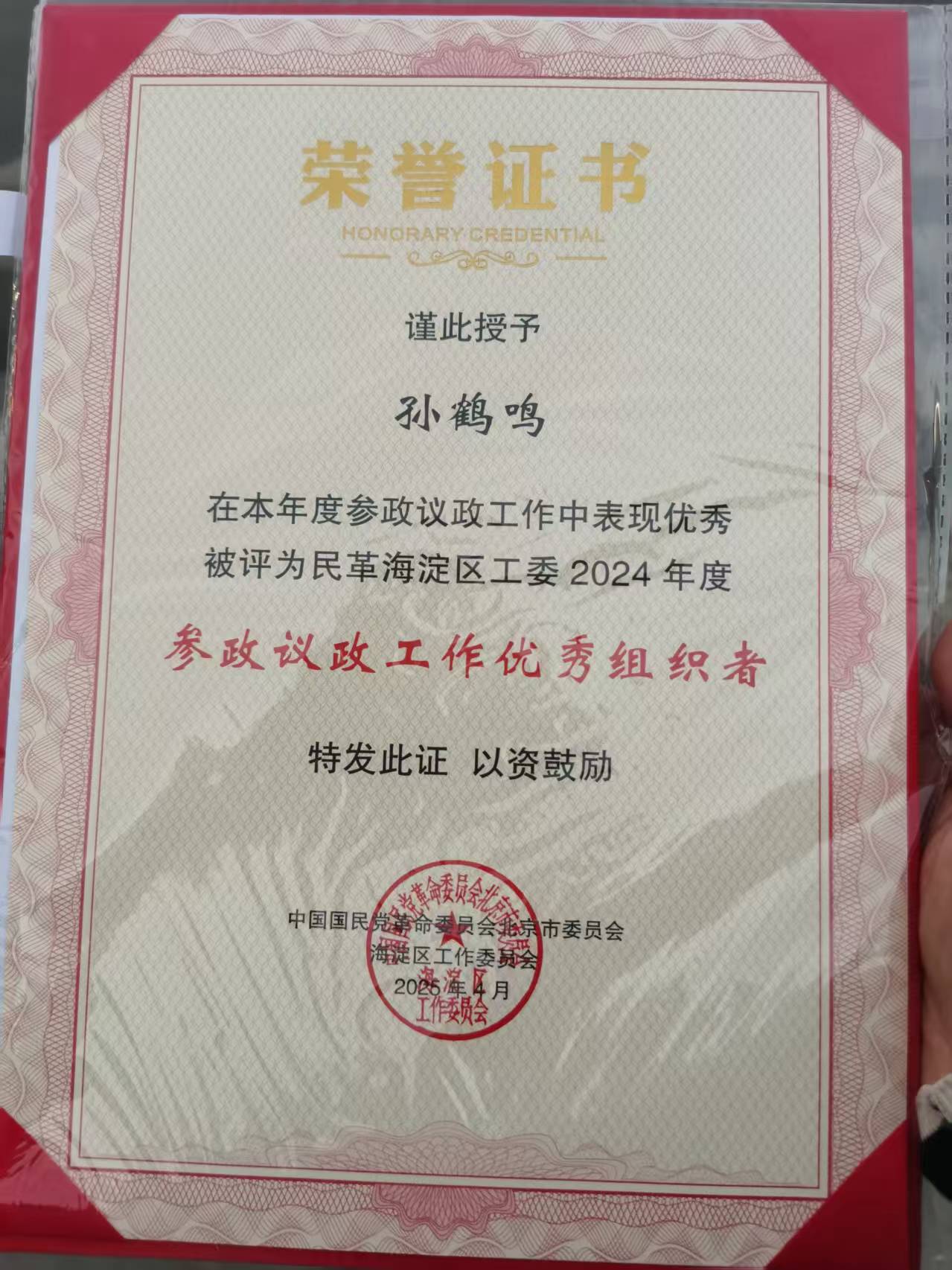 近日,民革北京海淀区工委在首农香山会议中心召开工作总结表彰会。周艺公益志愿者、江苏第二师范学院音乐学院音乐普及推广中心副主任孙鹤鸣同志以扎实的履职成果获评“参政议政工作优秀组织者”称号。