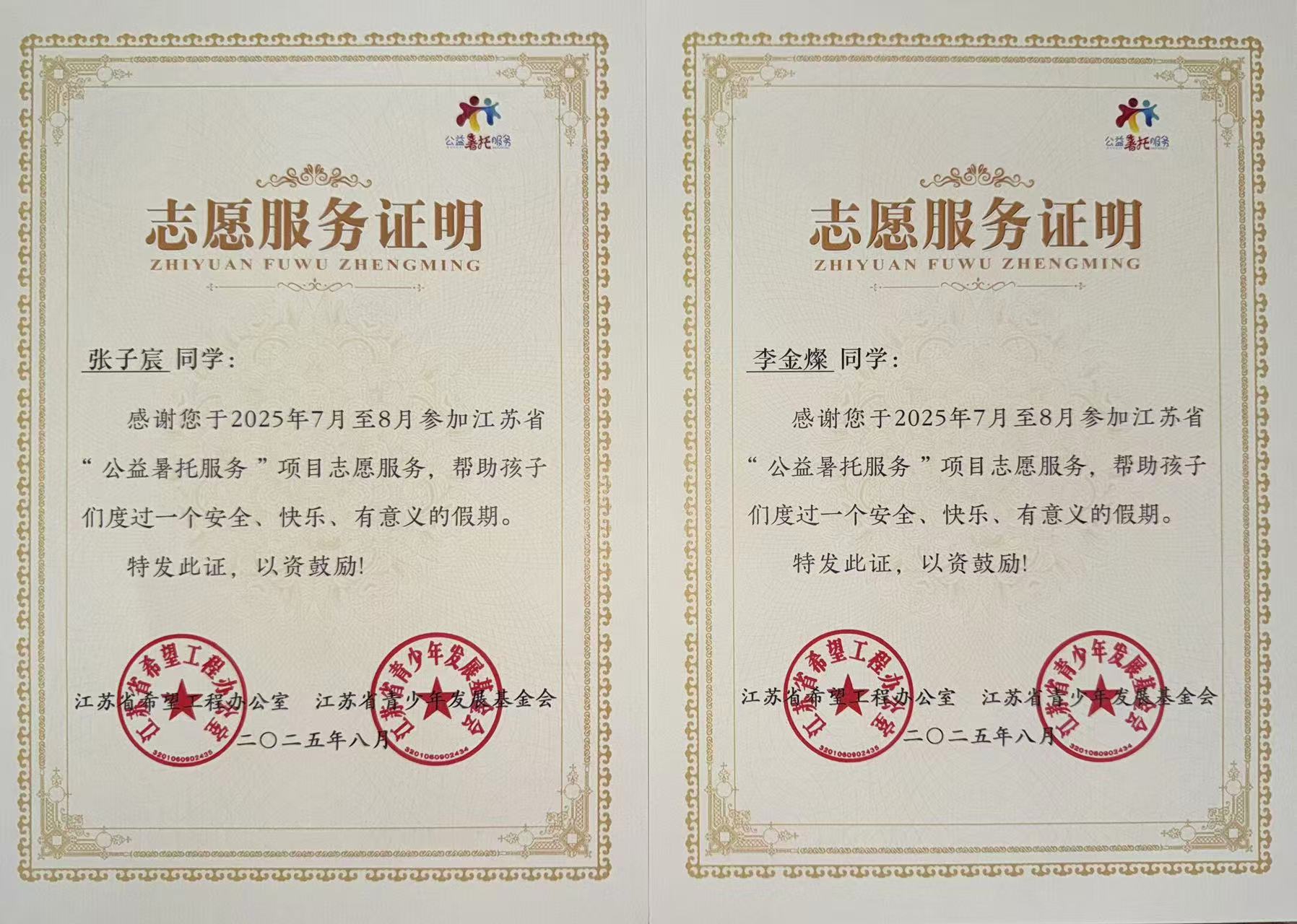 日前,周艺公益的李金燦、张子宸两名志愿者收到了由江苏省希望工程办公室、江苏省青少年发展基金会联合颁发的志愿服务证明,以表彰他们在2025年7月至8月参与江苏省“公益暑托服务”项目的贡献。