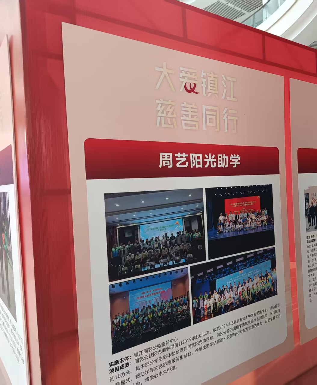 12 月 22 日,“慈善温暖救助行动”启动暨“镇江慈善20周年图片展”开展仪式正式举行,此次展览旨在全面展示镇江慈善事业20年发展成果,厚植“大爱镇江”慈善氛围,擦亮“家门口慈善”服务品牌。在展览中,周艺公益阳光助学项目的事迹图片精彩亮相,成为“大爱镇江 慈善同行”板块中的亮眼一笔。